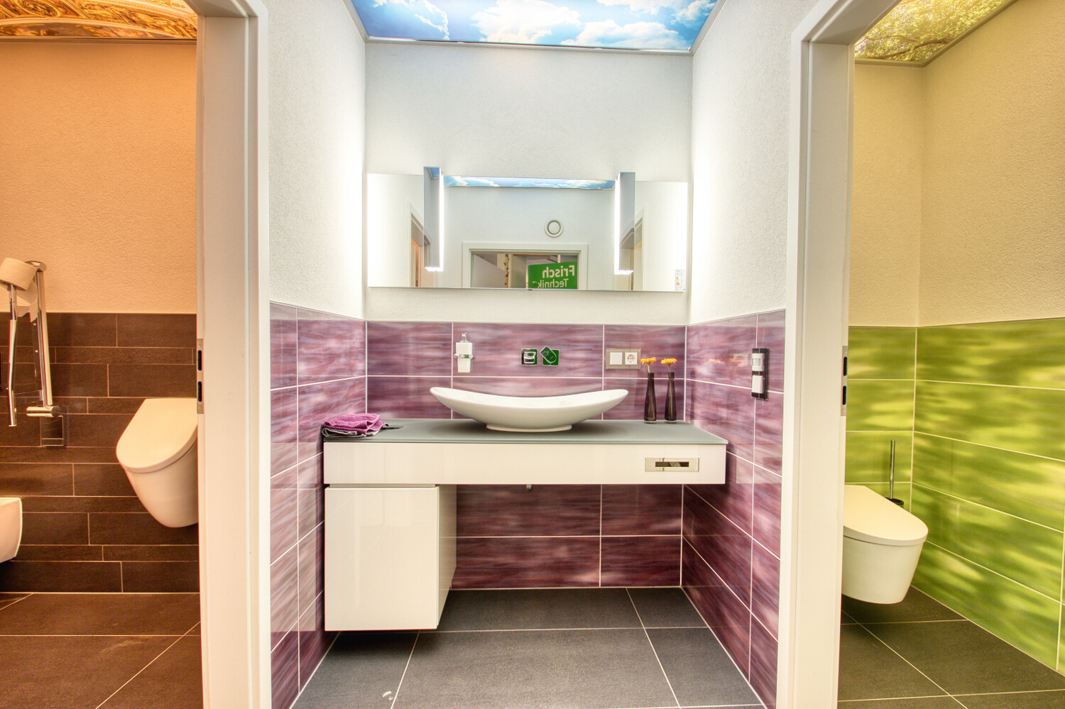 Neben der Ausstellungsfläche verfügen Sie über zwei moderne, hochwertige sanitäre Anlagen – eine davon Behindertengerecht – welche sich ebenfalls in einem äußerst modernen Zustand befinden.