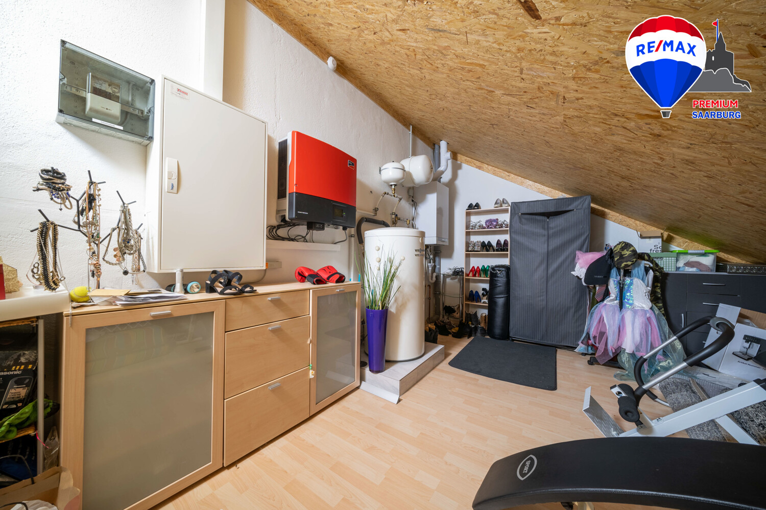Im Obergeschoss, das erst letztes Jahr umfassend renoviert wurde, befinden sich die insgesamt vier geräumigen Schlafzimmer sowie das hochwertige Bad. Die beiden Kinderzimmer liegen nach hinten und haben Zugang zum Balkon mit Blick in den Garten. Außerdem befinden sich hier oben der Hauswirtschafts- und der Technikraum in dem sich auch die Steuerung der erst in 2013 angeschafften Photovoltaikanlage befindet.