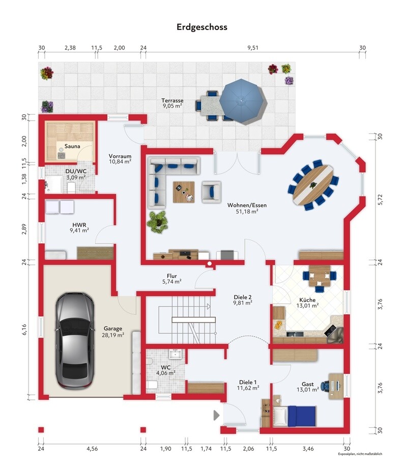 - gr. Wohn-Esszimmer, sep. Küche mit EBK, Diele Hauseingang, Diele Garage zum Haus, Gästezimmer, Gäste WC, Saunabereich mit DU/WC, Partyküche, 2 x Terrasse (ca 26,5m² und 9,6m²), Garage (ca.26m²) mit Zugang zum Haus