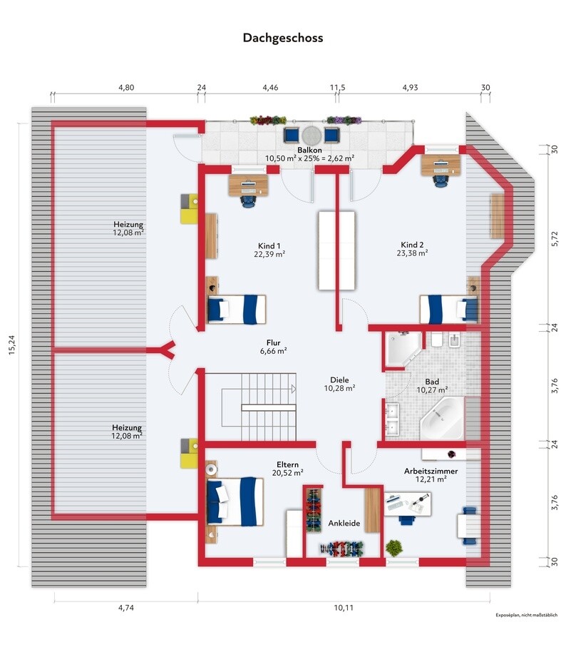 - 2 x Kinderzimmer, 1 Eltern-SZ mit Ankleide, Büro/Gästezimmer, Diele, Balkon (c.a 8,5m²), Bad mit Eckwanne, DU, Doppelwaschb, + Nutzräume (Technikraum und HWR), + Spitzboden-Speicher über DG
