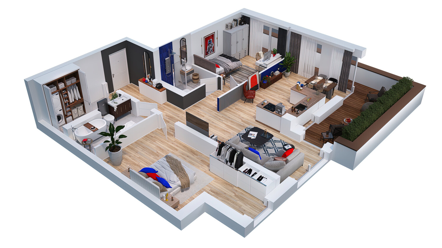 Ihr neues Badezimmer, mit ebenerdiger Wanne, befindet sich direkt neben Ihrem freundlichen Schlafzimmer. Das zweite, großzügige Schlafzimmer befindet sich direkt neben dem Wohnzimmer. Natürliches Licht erhält Ihr Badezimmer durch eine Lichtkuppel.