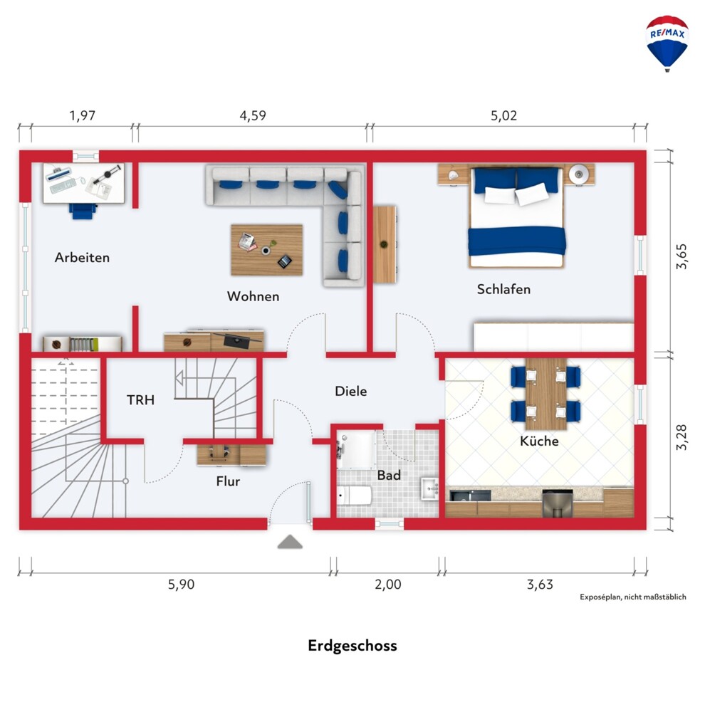 Im Obergeschoss befinden sich eine großzügige Küche mit Durchgang zum Wohn-/Essbereich und offen anliegendem Arbeitsbereich. Auch hier sind alle Räumlichkeiten im offenen Konzept vom Flur aus begehbar.