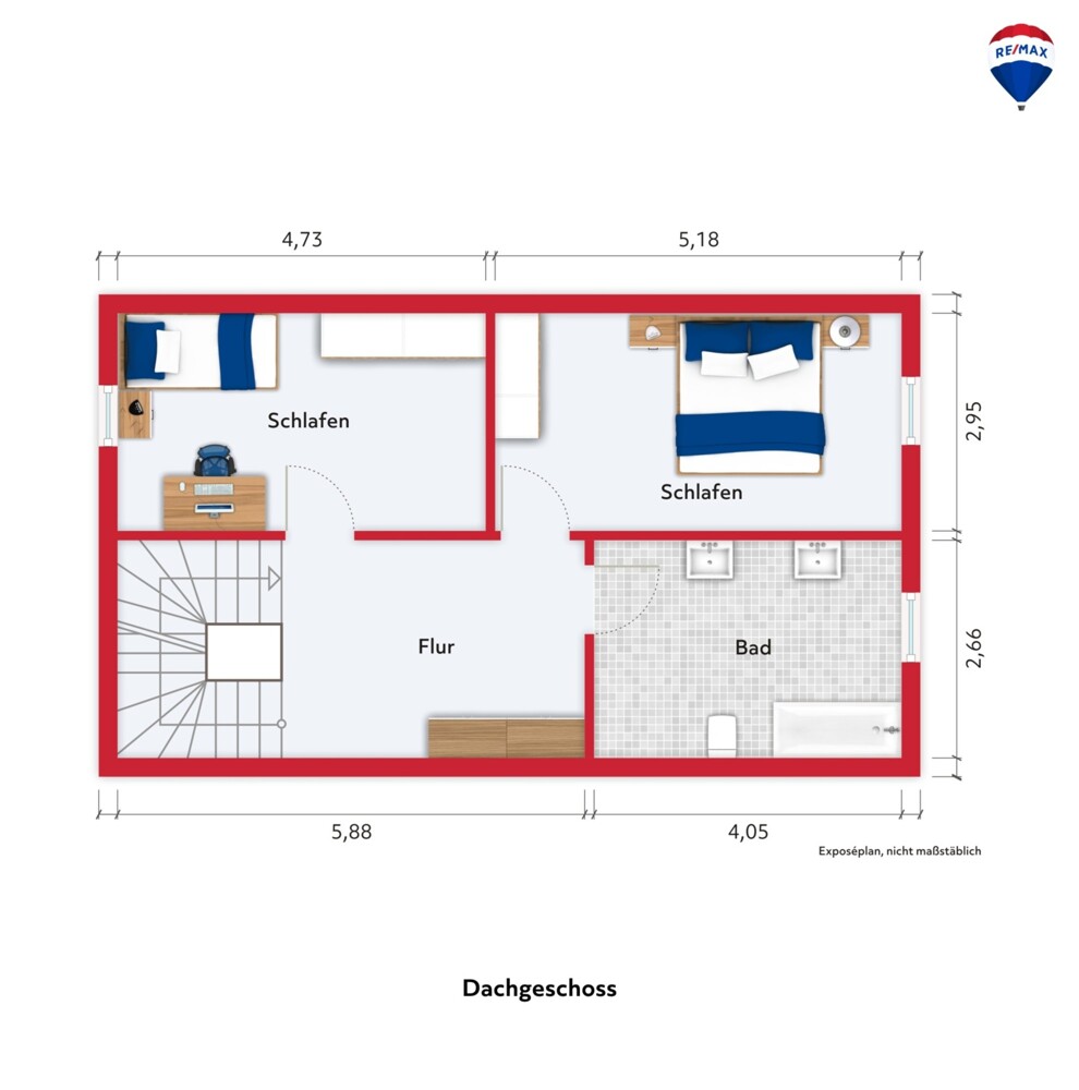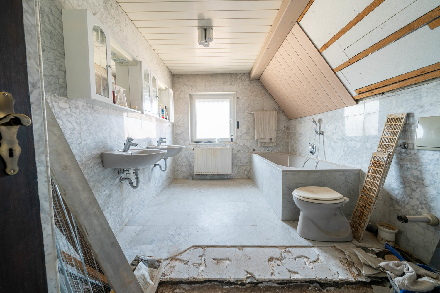 Im Dachgeschoss liegen zwei Schlafzimmer und das Badezimmer mit Marmorfliesen, ausgestattet mit zwei Waschbecken und einer Badewanne. Hier wurde eine bodentiefe Dusche geplant, dies können Sie vollenden und Ihren eigenen Stil mit einbringen. Das Dachgeschoss bietet ebenfalls viel Staufläche.