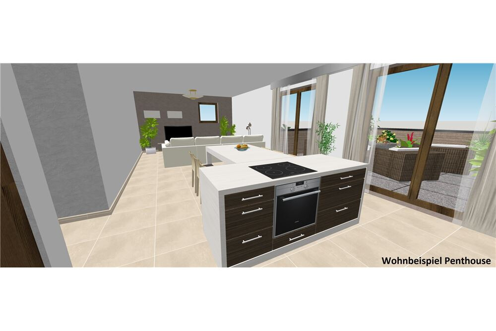 Im Anschluss eröffnet sich Ihnen das fast 40m² große Wohn- Esszimmer mit offener Küche. Es bietet Ihnen dank der großen bodentiefen Fenstern einen maximalen Wohnkomfort. Eine hochwertige Einbauküche wartet bereits auf Ihre Kochkünste.