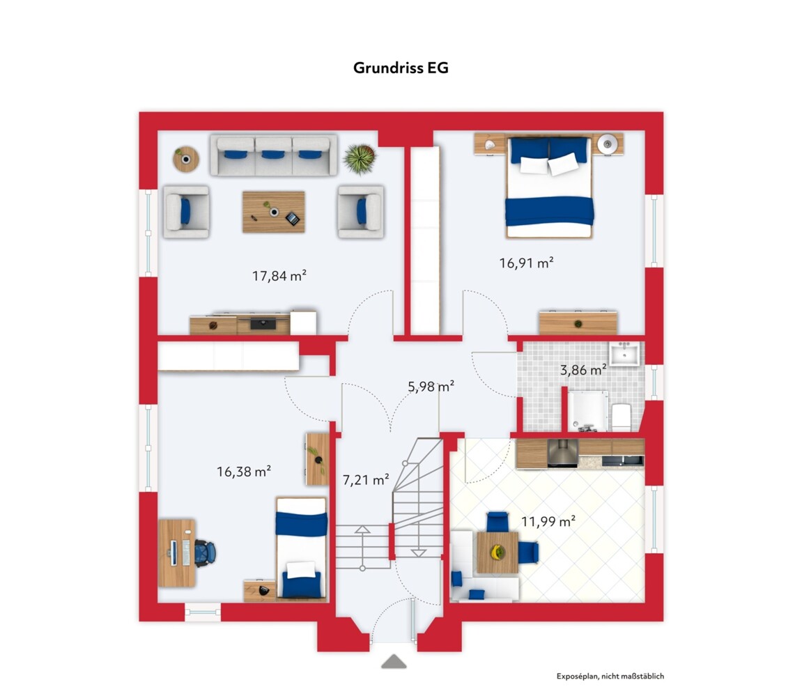 Im Erdgeschoß befinden sich auf ca. 80m² ein helles Wohnzimmer, zwei geräumige Schlafzimmer, ein Badezimmer und eine großzügige Küche.