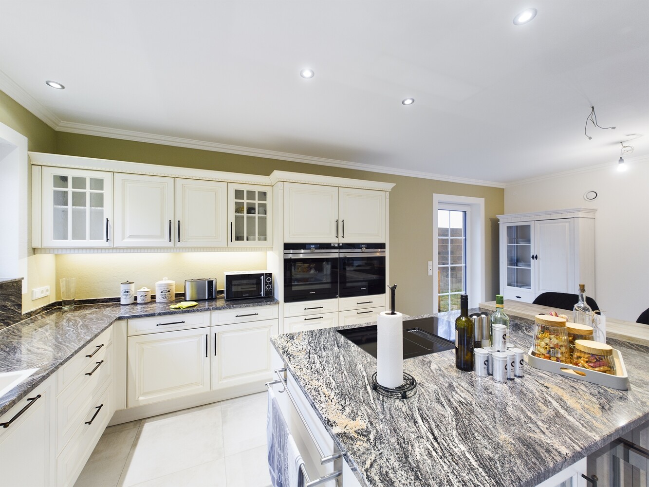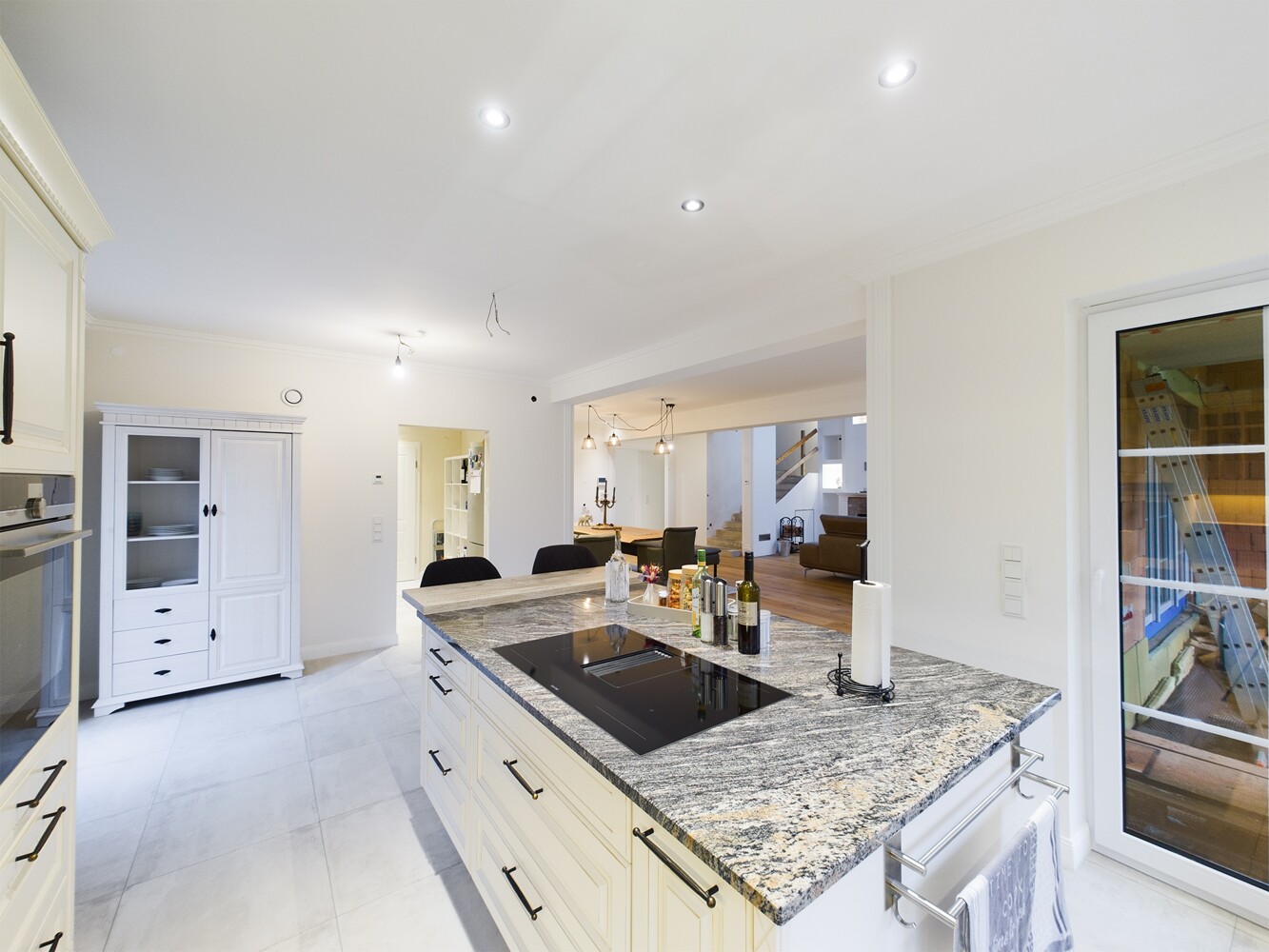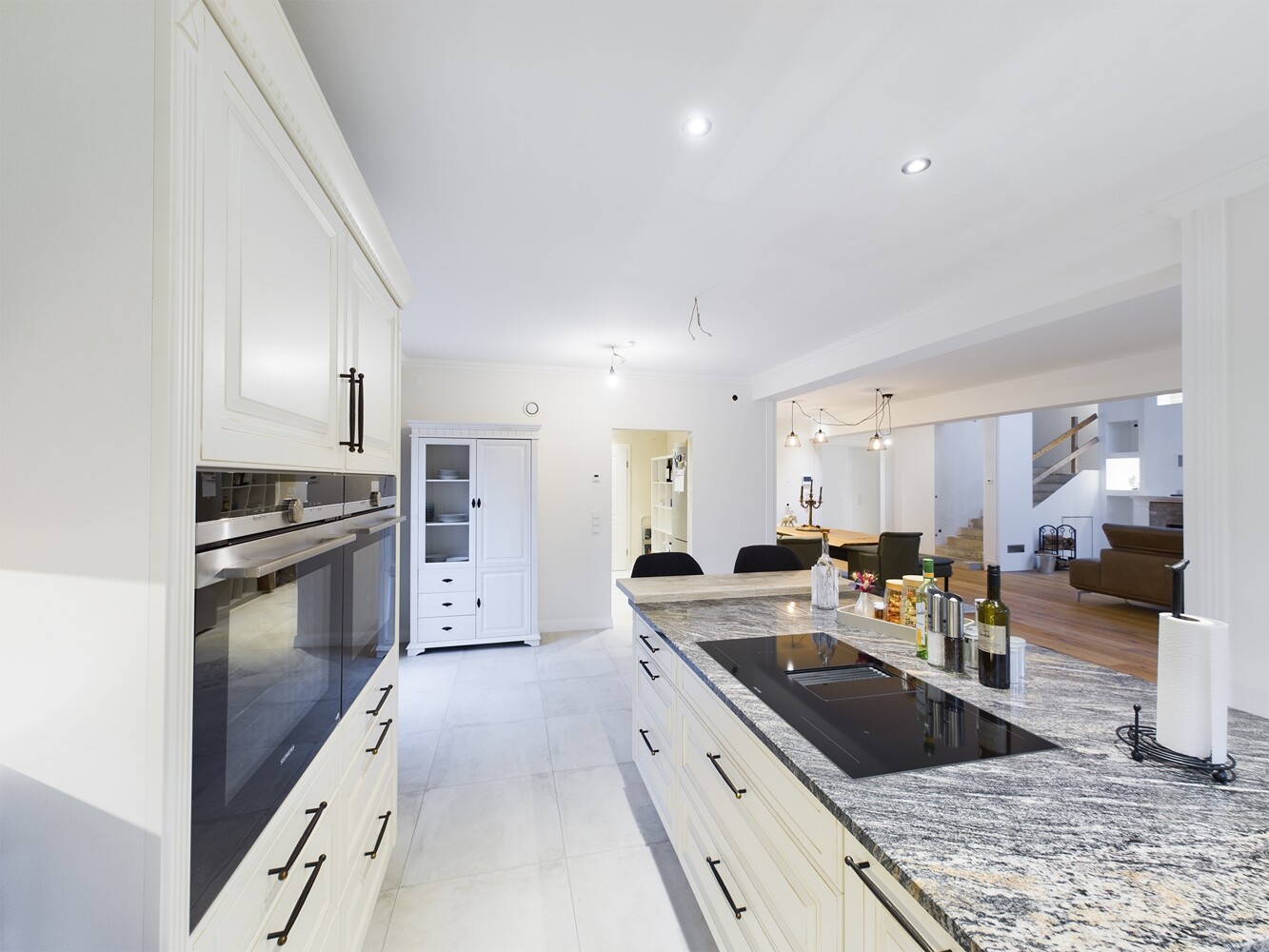 An den Wohn-Essbereich schließt sich die große offene Küche mit hochwertigen Geräten und durchdachtem Konzept an.