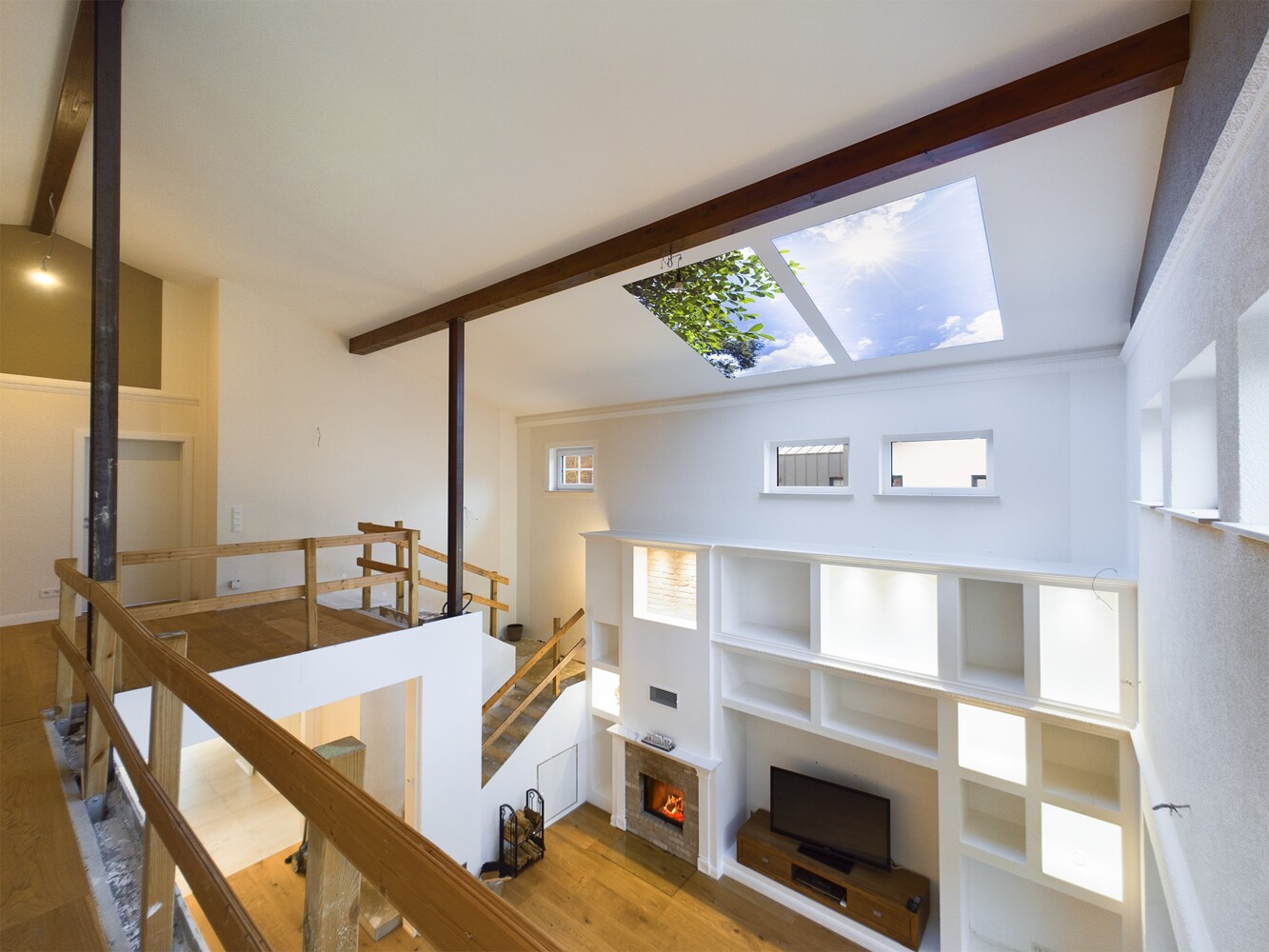 Über die Treppe, welche ebenso wie das Geländer noch auf ihre Fertigstellung wartet, erreichen Sie die Galerie des Obergeschosses.