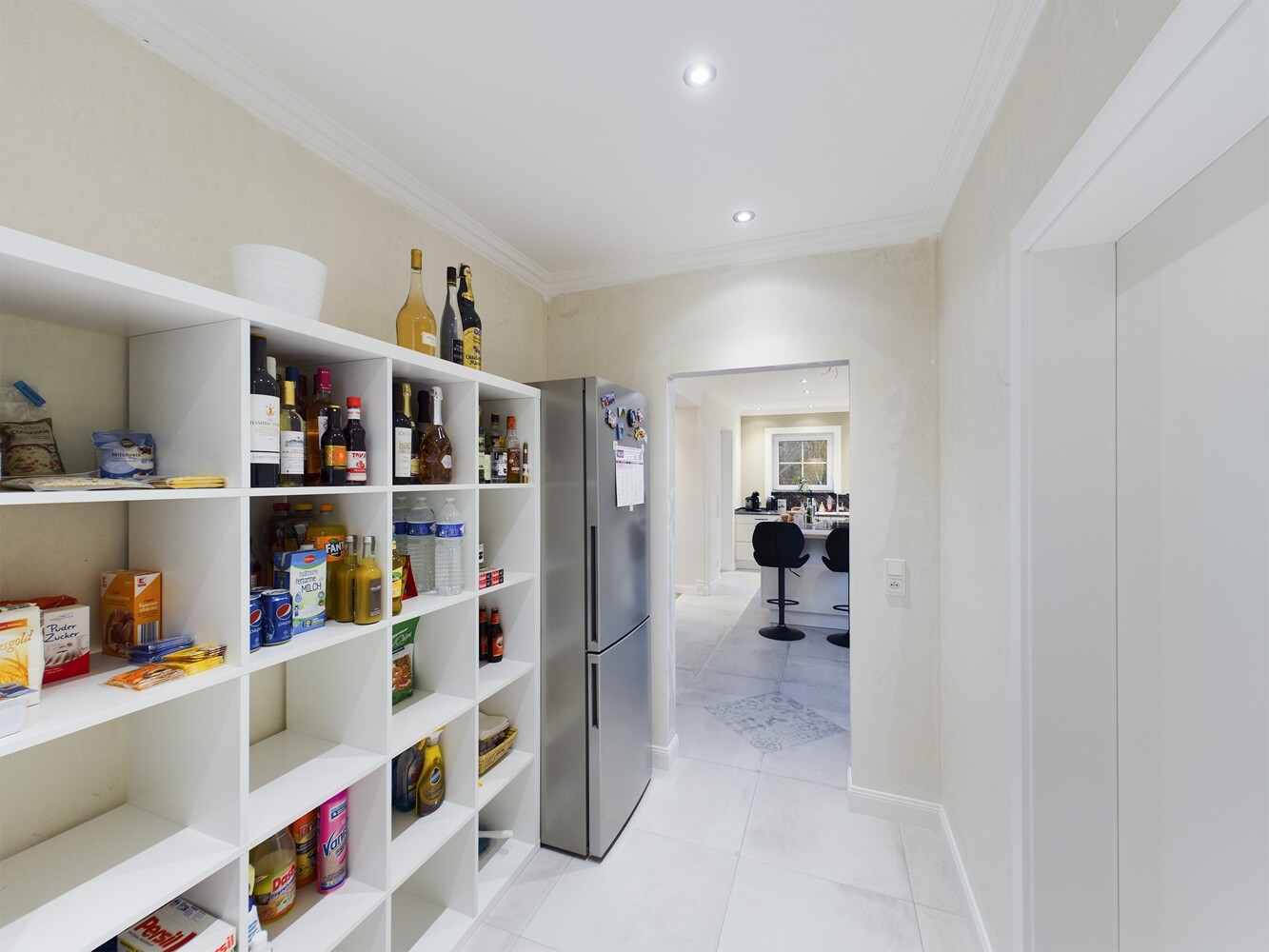 Von der Küche aus erreichen Sie den Vorratsraum, welcher durch seine ca. 5,80m² viel Platz für Ihre Einkäufe bietet. Diese können Sie aufgrund des direkt angrenzenden Zugangs von der Garage trockenen Fußes in den Regalen verräumen. An den Vorratsraum schließt sich auch der Hauswirtschaftsraum mit Waschmaschine und Trockner an. Hier kommt die Schmutzwäsche aus dem Ankleidezimmer durch den praktischen Wäscheabwurfschacht im Wäschesack an.