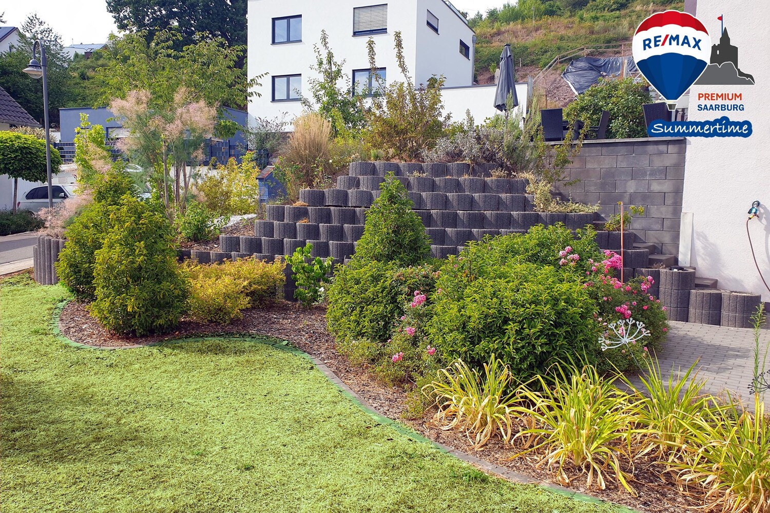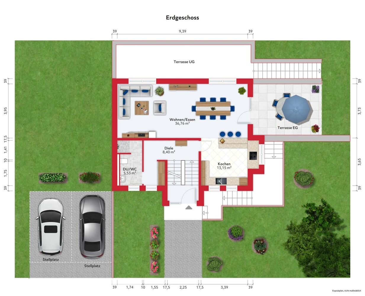 Der Außenbereich bietet großzügige Platzverhältnisse. Links vor dem Haus befinden sich zwei PKW-Stellplätze. Vor dem Haus und zur Westseite hin wurde ein hübscher Vorgarten mit den Abgängen zu den beiden Terrassen im EG und UG angelegt. Hinter dem Haus liegt der Garten und Spielbereich der von Obstbaumpflanzungen auf der Ostseite ergänzt wird.