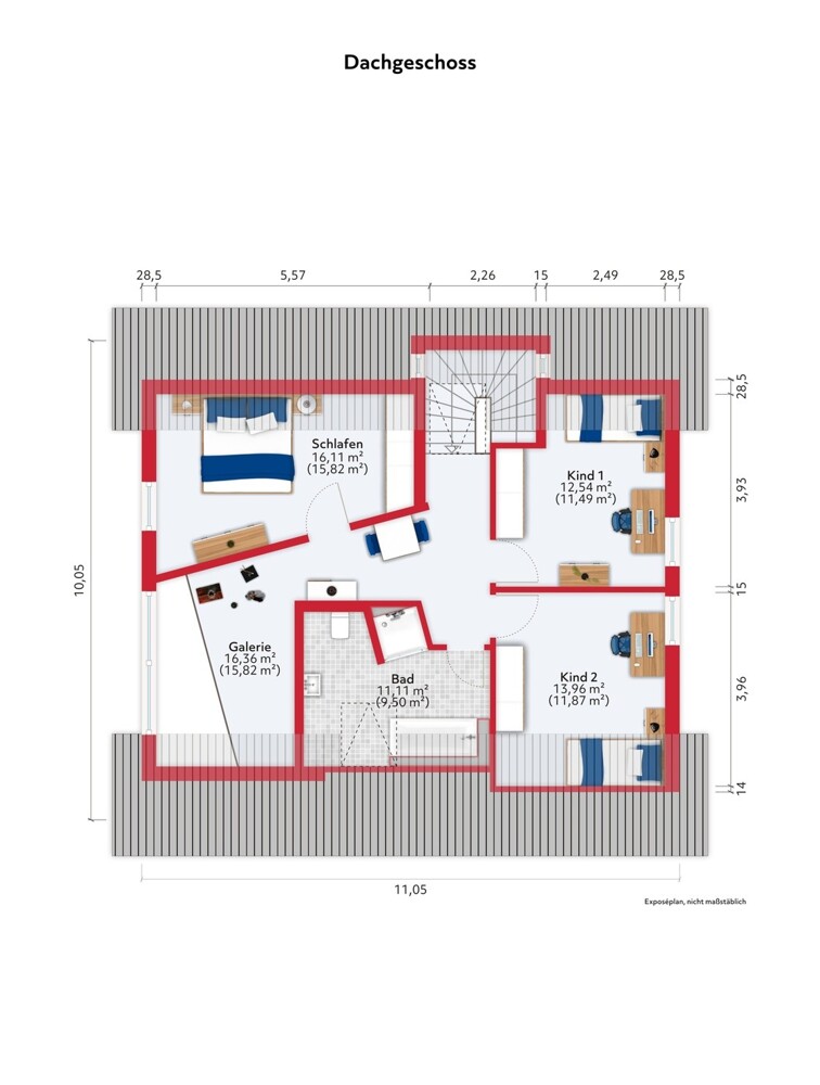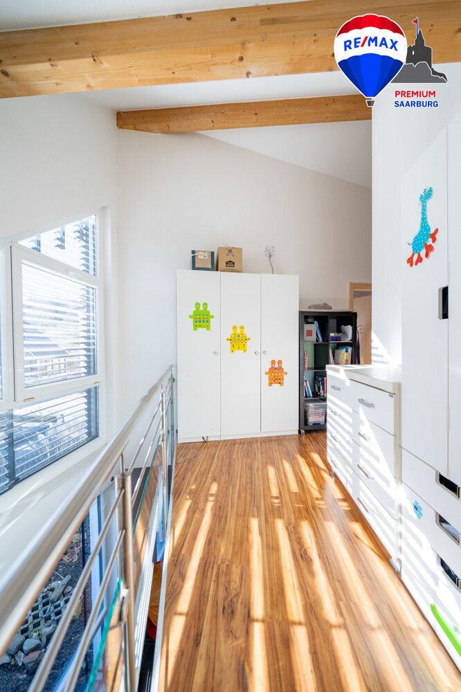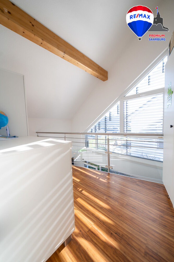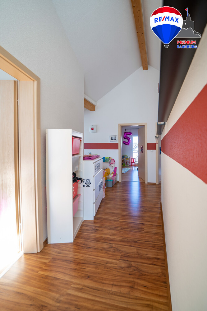Im Dachgeschoss befinden sich die drei großen Schlafräume und das große Familienbadezimmer.  Diebeiden Kinderzimmer bieten mit jeweils ca. 11m² gleich aufgeteilte Platzverhältnisse. Das Highlight hier ist die schöne Galerie, die als Arbeits-oder als Leseplatz dient.
