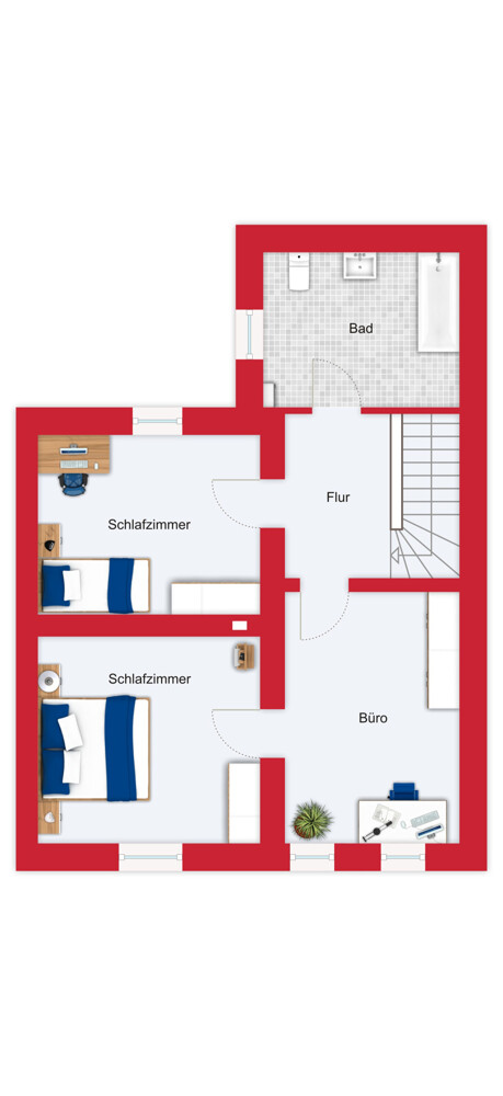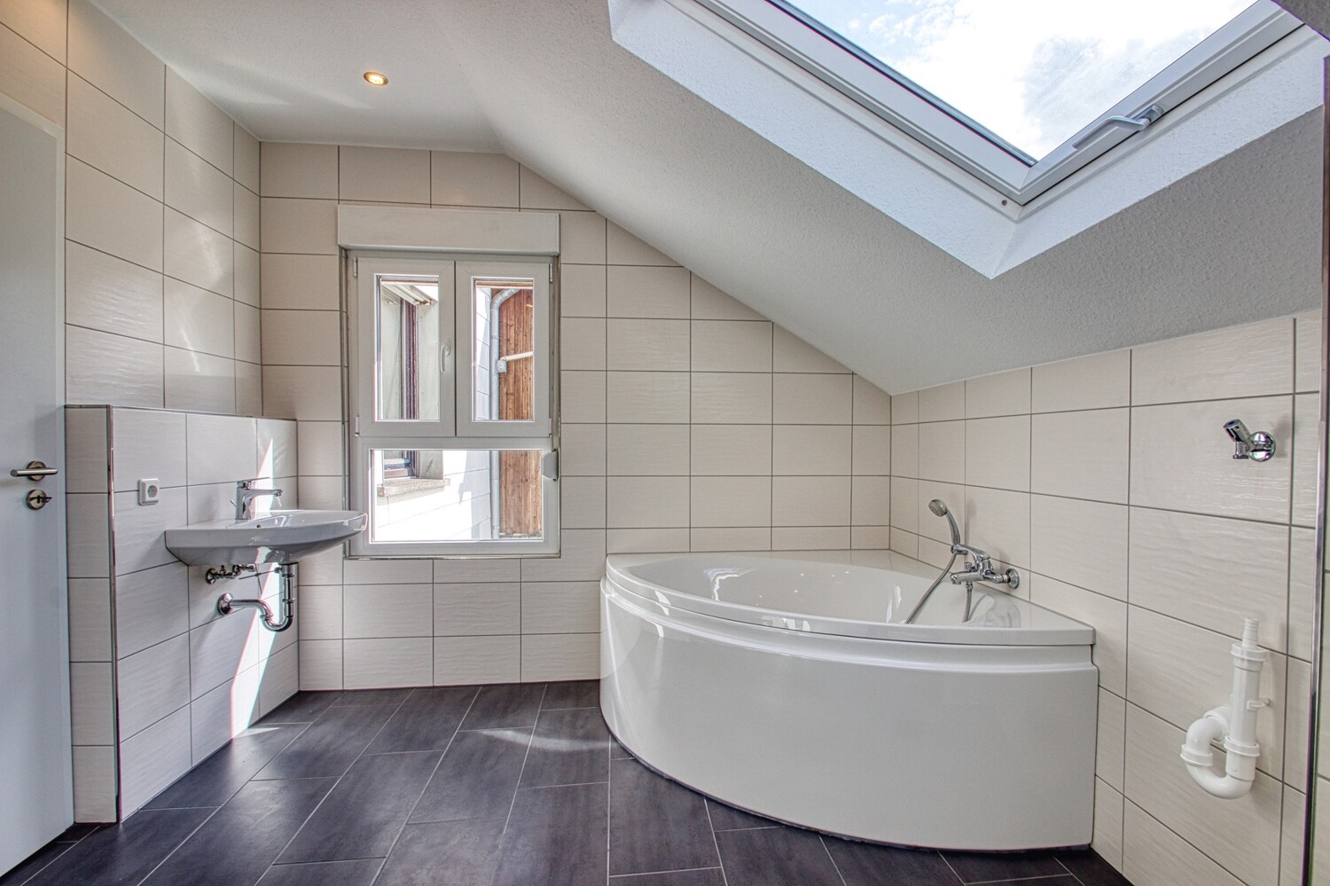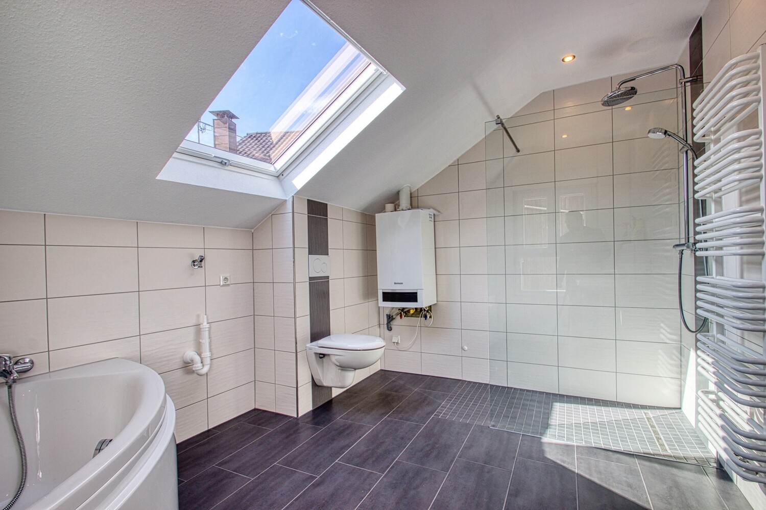 Über die helle und großräumige Diele erreichen Sie Ihr Obergeschoss. Dieses hält drei weitere Räumlichkeiten und das Badezimmer für Sie bereit. Das Bad wurde 2021 renoviert und wurde zu einem modernen Wohlfühlbereich umgestaltet. Es begeistert mit einer barrierefreien Dusche, einer Badewanne zum Entspannen und einem großen Dachfenster, welches für Tageslicht sorgt.