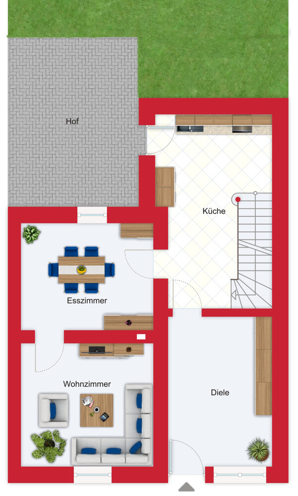Es empfängt Sie ein einladender und großzügiger Eingangsbereich, welcher Sie auf direktem Weg in die offen gestaltete Küche führt. Von der Küche erreichen Sie das Esszimmer, welches viel Platz für die Familie bereithält, sowie das daran anschließende Wohnzimmer. Von der Küche gelangen Sie nach draußen in den Hof, sowie zu der überdachte Terrasse, unter der Sie an warmen Sommertagen Ihren Tag genießen können.