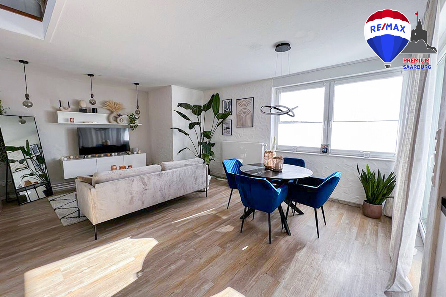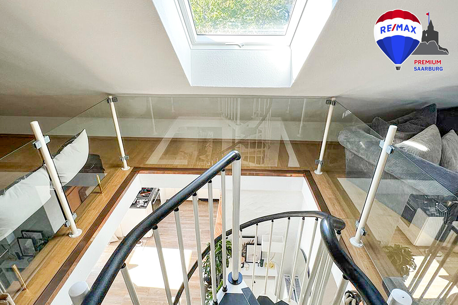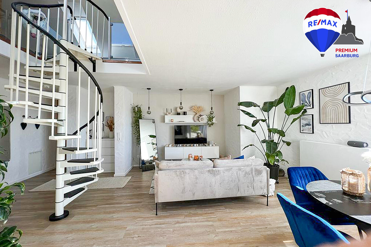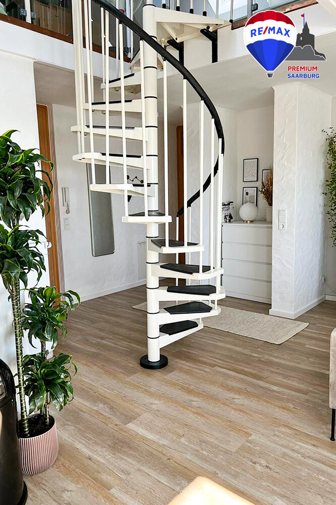 Ein weiteres Highlight der Wohnung stellt die offene Galerie im Dachgeschoss dar, die man über die schicke schwarz-weiße Wendeltreppe aus dem Wohnzimmer erreicht. Der zusätzliche Bereich mit seinen Dachschrägen schafft Gemütlichkeit und bietet zahlreiche Möglichkeiten der Nutzung.