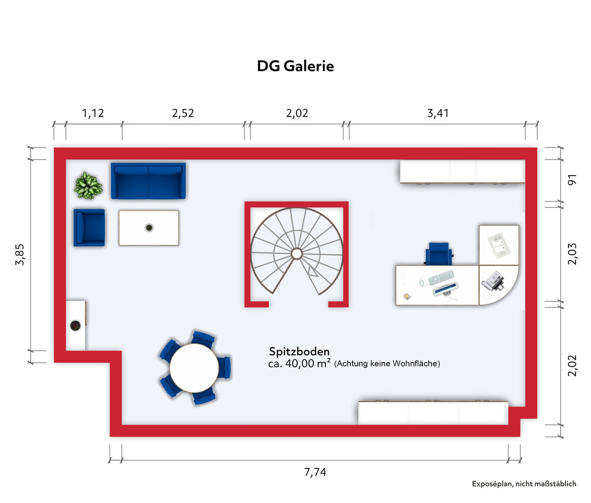 Flächen: ges.: 60,93 m² / Wohnfläche mit zusätzlichen, nicht in der Wohnfläche zu berücksichtigenden ca. 40, m² großen Galeriebereich im Spitzboden, Balkon 4m² ,