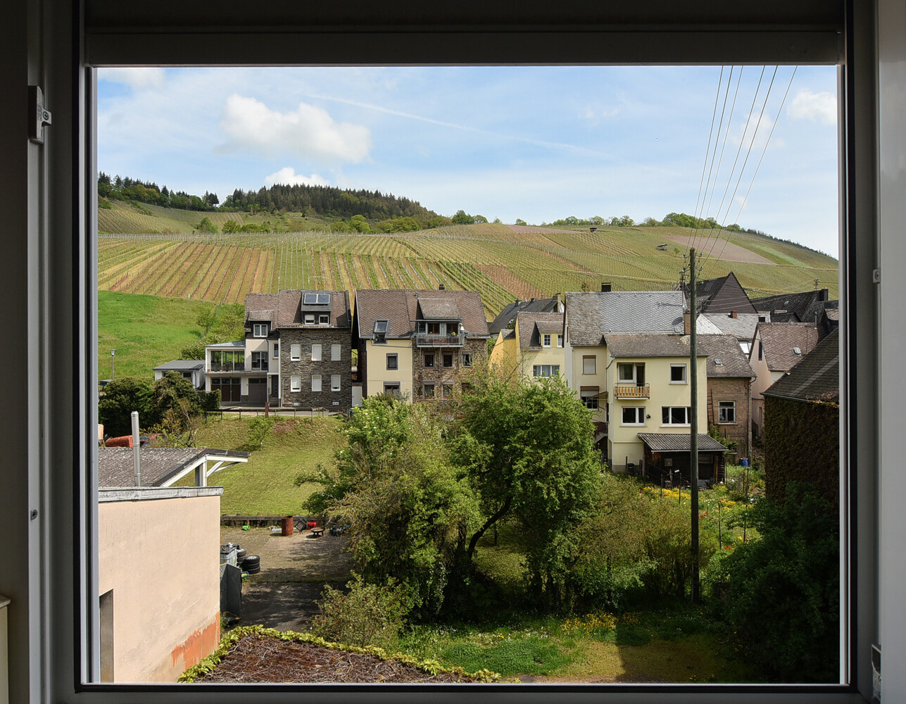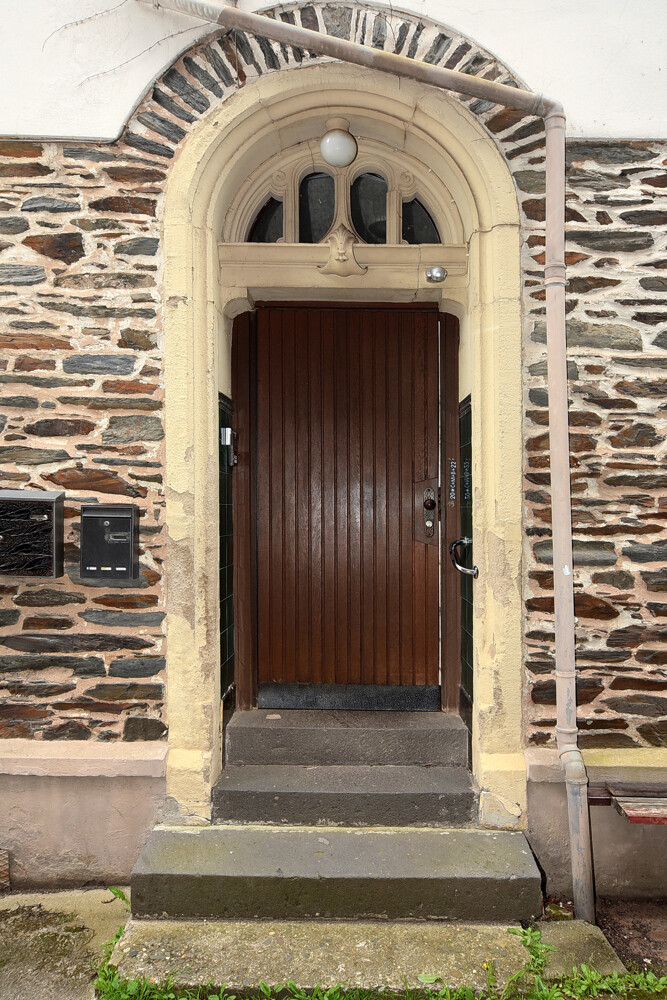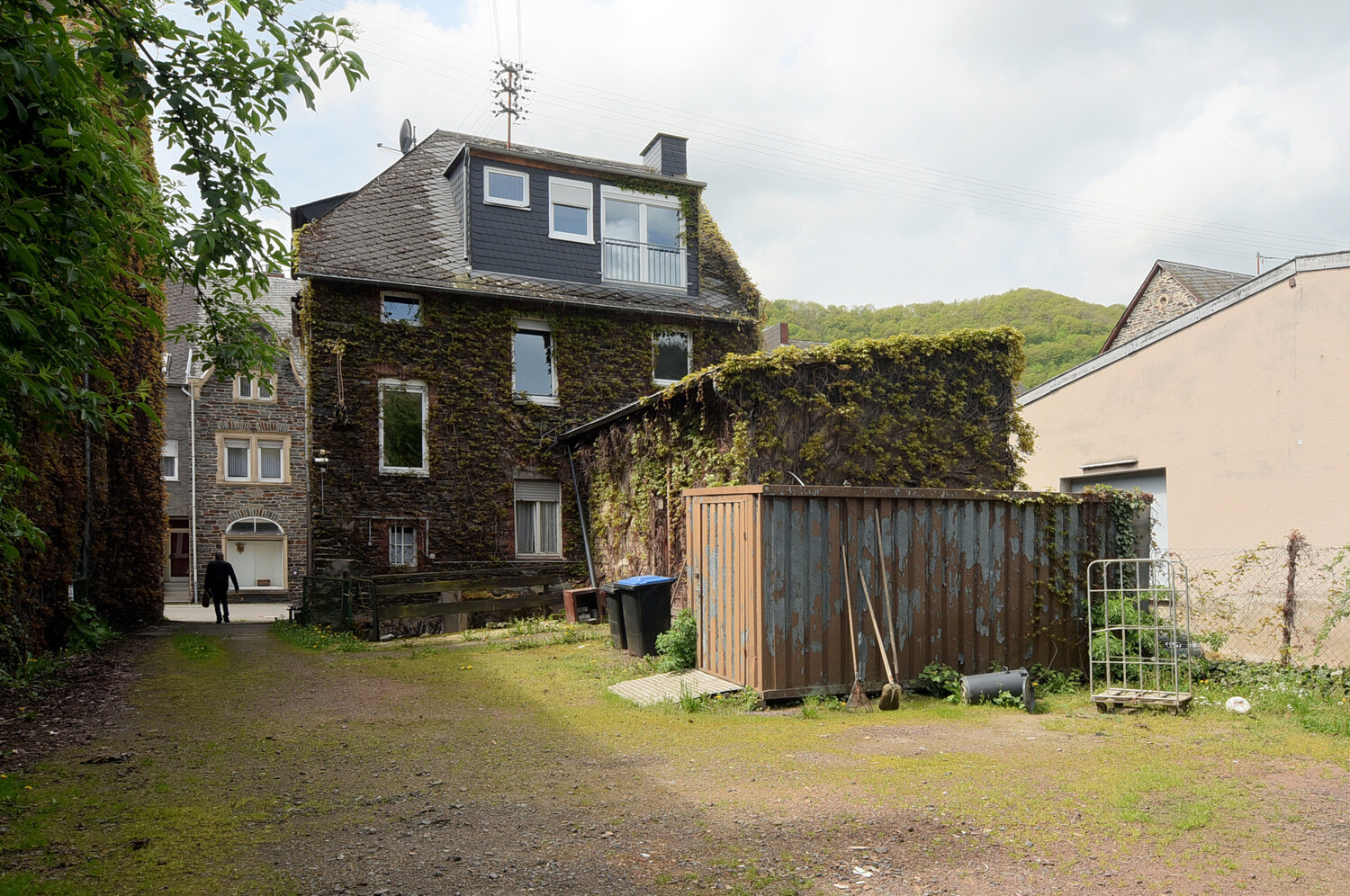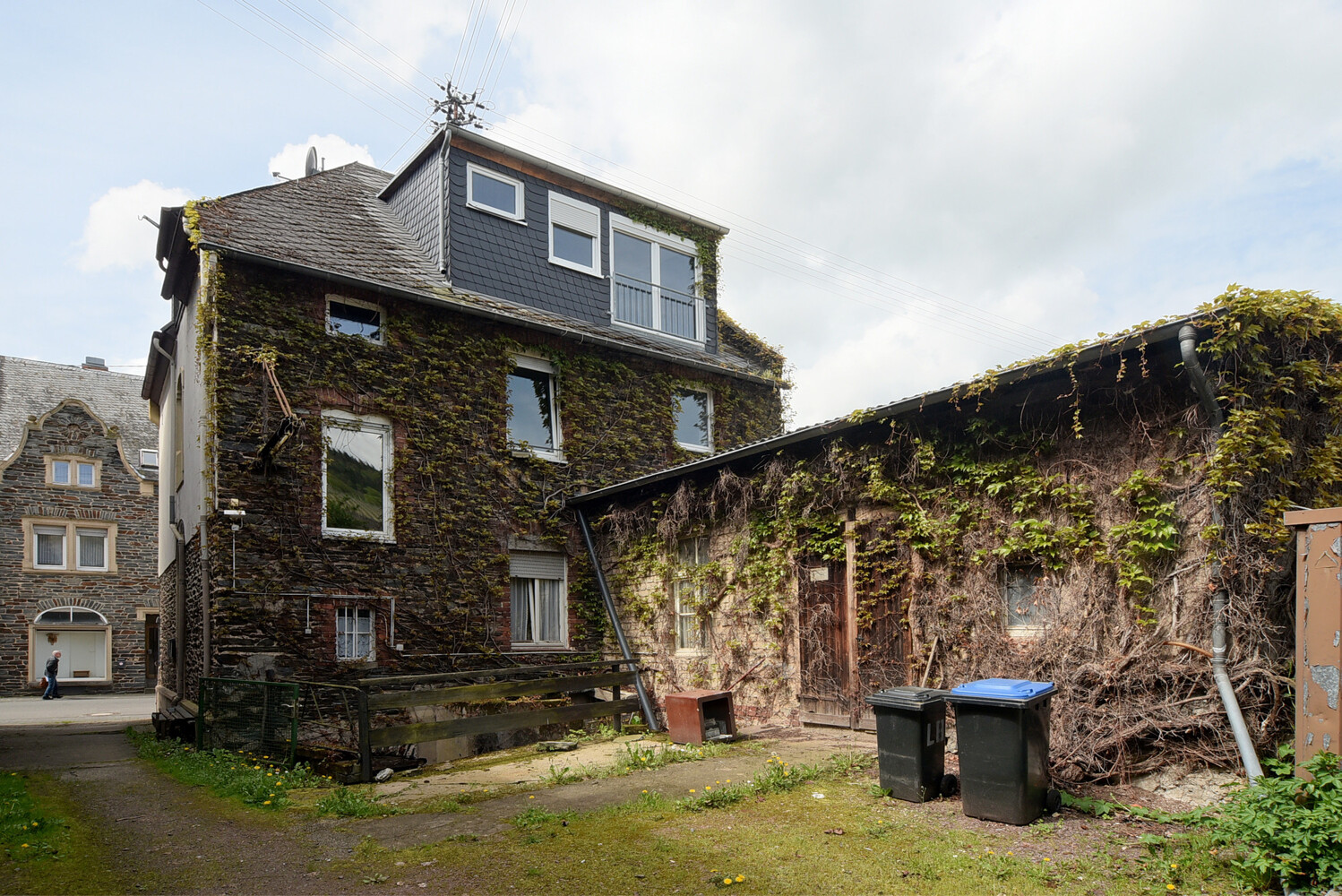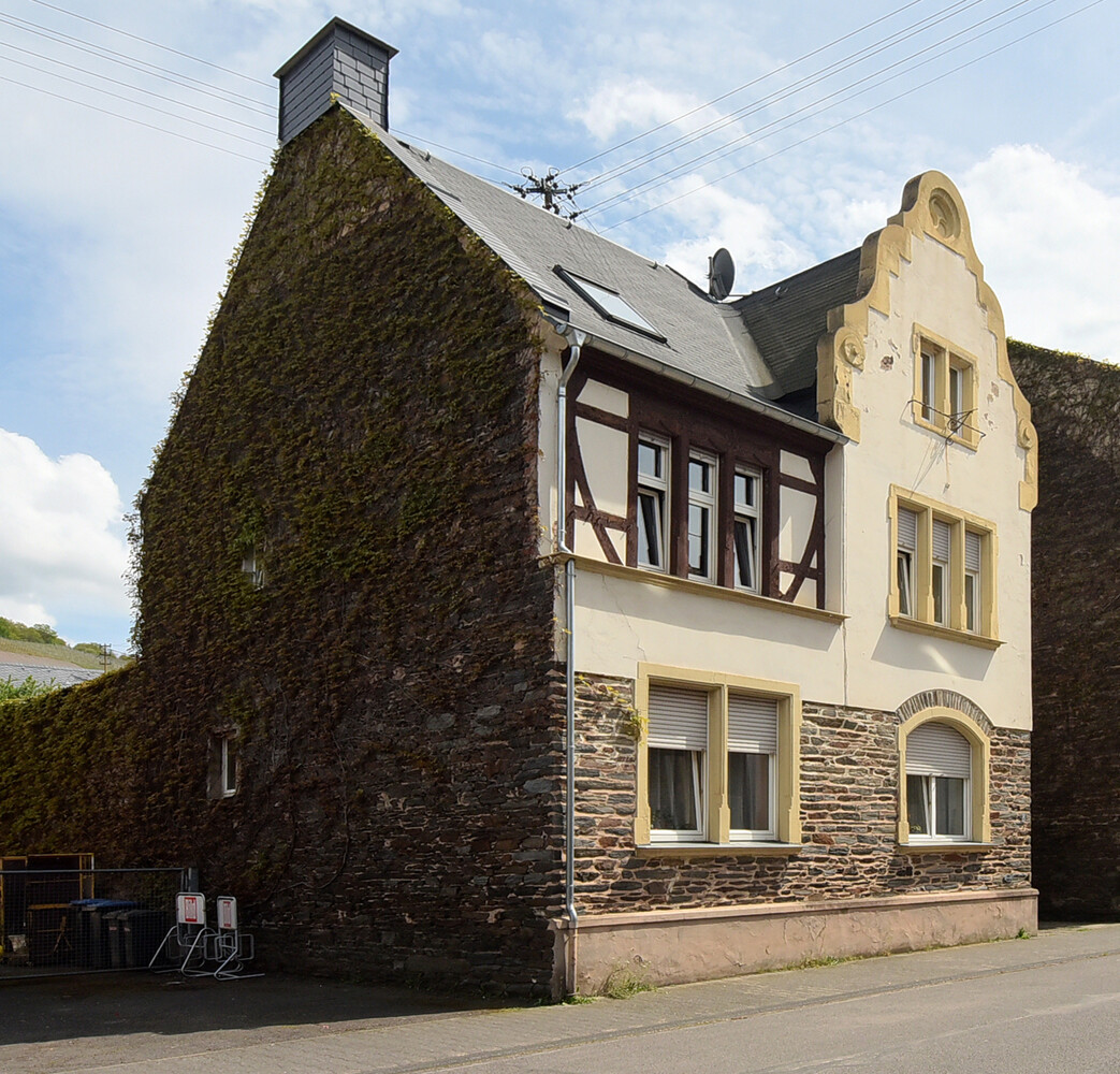 In der Bahnhofstraße 8 atmet man – wie in den oberen Stockwerken der Bahnhofstraße 6 – Vergangenheit: die Fassade ist geradezu eine Reminiszenz an die Enkirch markierenden Fachwerkhäuser und – erlaubt man die Fassade zu sprechen – an den Jugendstil der ersten Jahre des 20. Jahrhunderts. – Die Zugabe erfährt man dann in einem kleinen rückseitigen Anbau, der als Handwerksbetrieb genutzt war und natürlich auf der Freifläche um das Haus, die eine Umwandlung zu Fahrzeug-Abstellplätzen aber auch in ein Grünareal schätzen könnte.