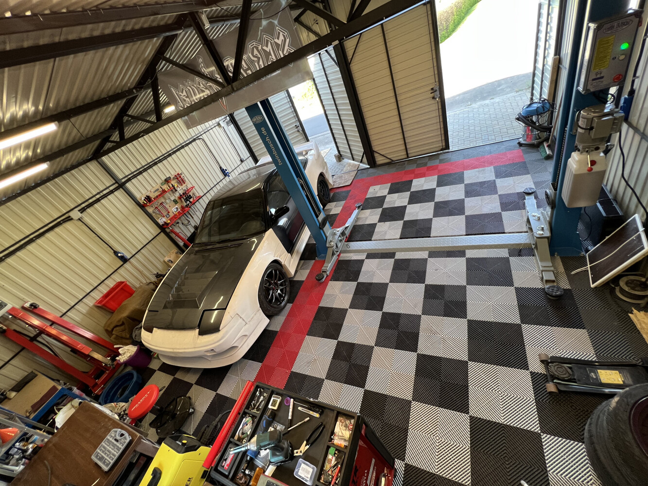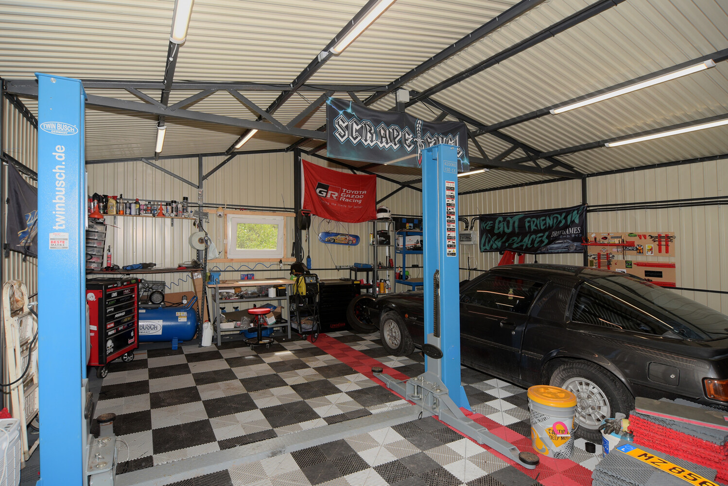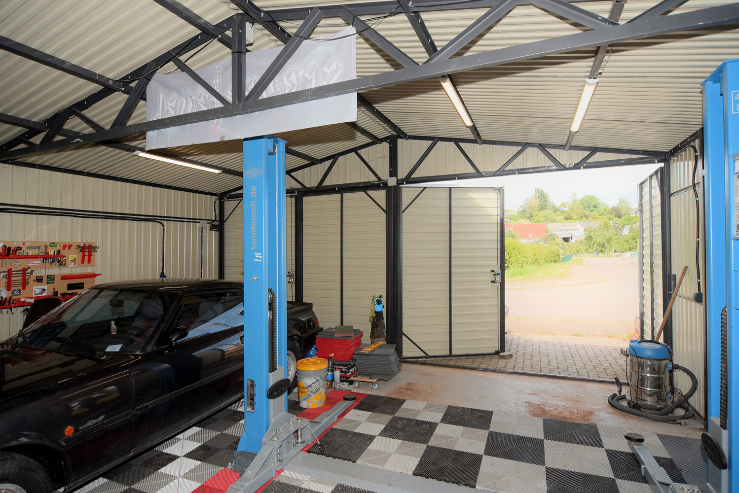 Auf Grund der mit der Leidenschaft für Fahrzeuge verbundene Unterstell-Notwendigkeit wurde wahrscheinlich noch vor der Modernisierung des Hauses die elektrischen Rolltore an den beiden Garagen installiert, so dass hier ein gut nutzbarer Raum (mit einer Fläche von 3 x 8 und 3 x 5 Metern) für mindestens drei Fahrzeuge plus Zweirad-Abstellmöglichkeiten entstand.