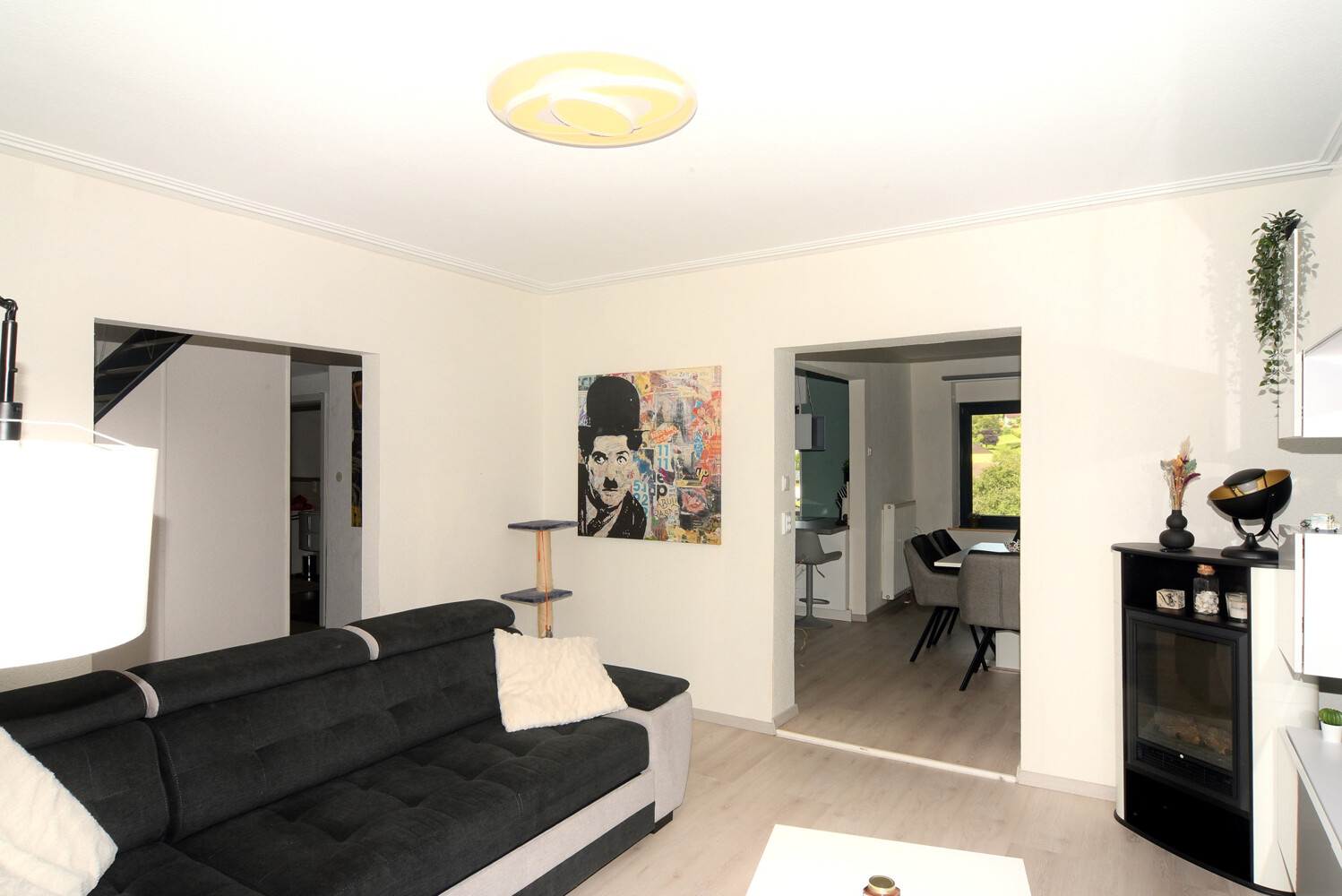 Eingentlich müsste man sagen: das Haus mit der Lust am Wohnen. Denn das Sich-Wohlfühlen erlebt man beim Eintreten. Rechts geht es in einen großen Wohnraum, der Verbunden ist mit einer Küche mit Ess-Areal und einer Fortsetzung in einen Hauswirtschaftsraum, welcher noch die Vorgänger-Küche behalten hat, so dass von hier aus das Gartenareal mit warmen und kalten Speisen bewirtet werden kann… Im Erdgeschoss befindet sich weiter eine Tür in die Kellerräume (das Haus ist zu 100 % unterkellert – mit weiterem Zugang zum Garten) und im Erdgeschoss ist auch noch ein modern eingerichtetes Badezimmer wie der Zugang zur kleineren Garage.