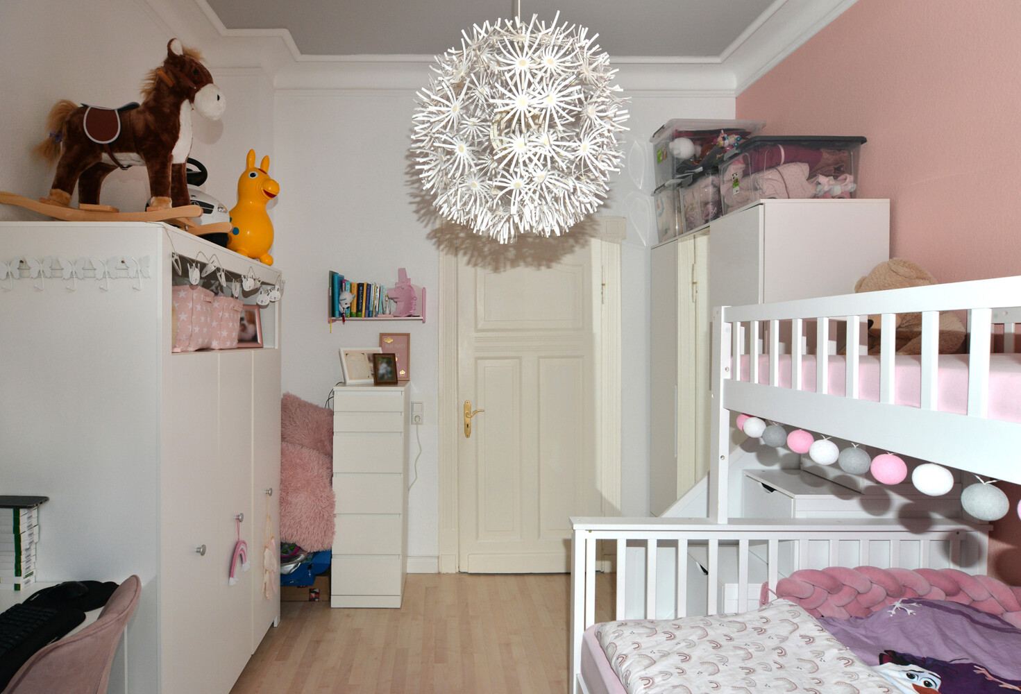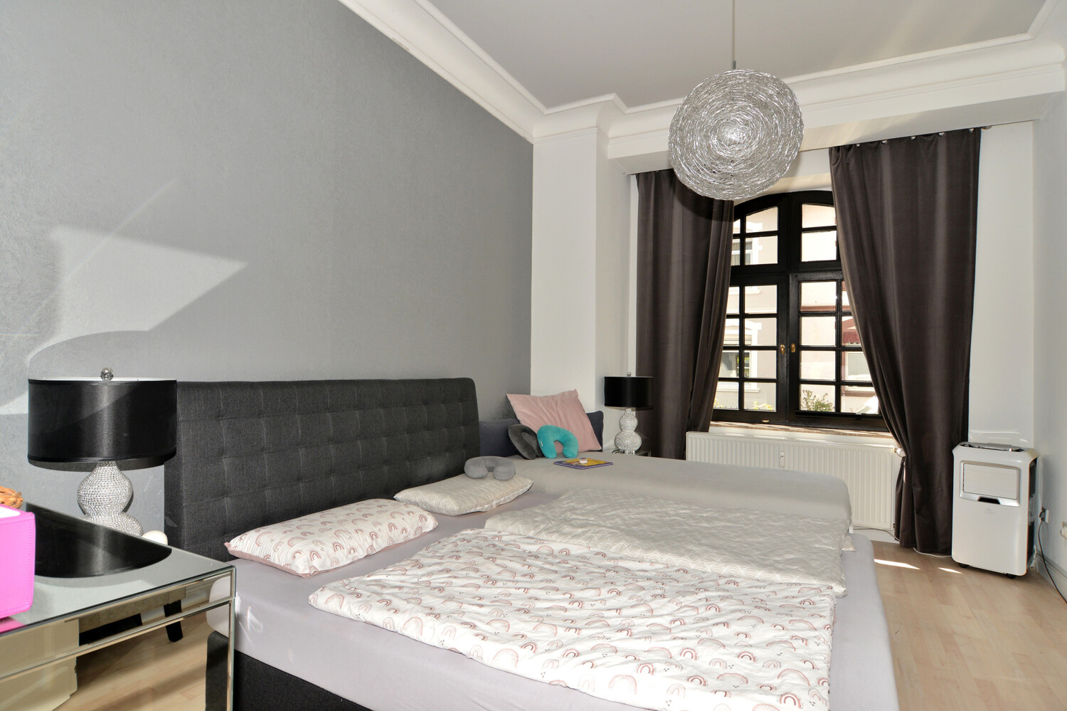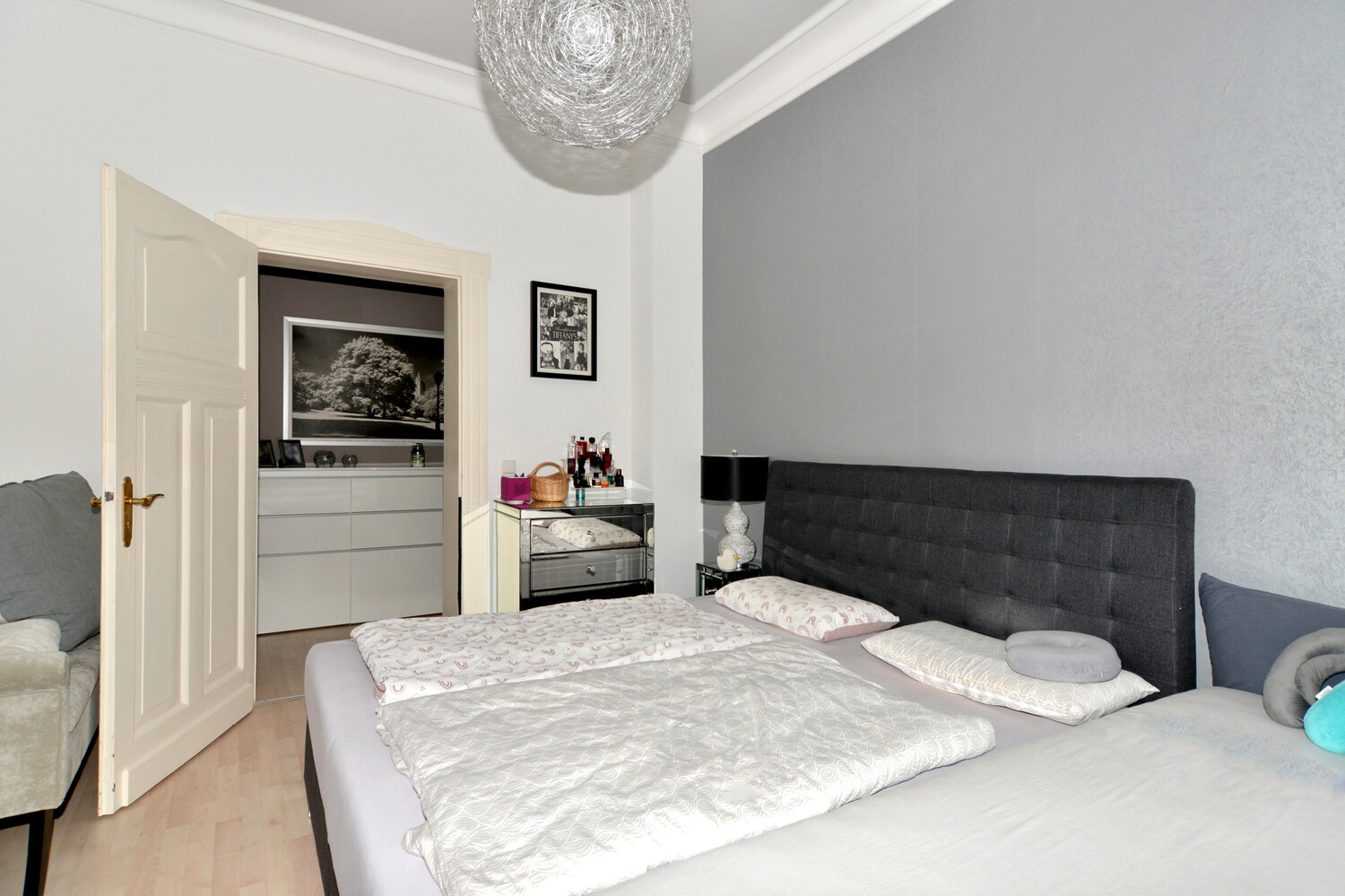 In der restlichen Wohnung liegt helles Laminat aus.