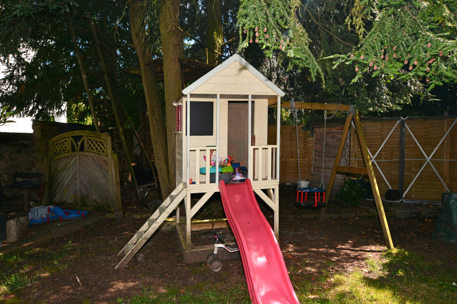 Das Grundstück ist voll umzäunt und bietet damit zusätzliche Sicherheit für junge Familien mit Kindern, die viel Platz im Garten zum Spielen haben.