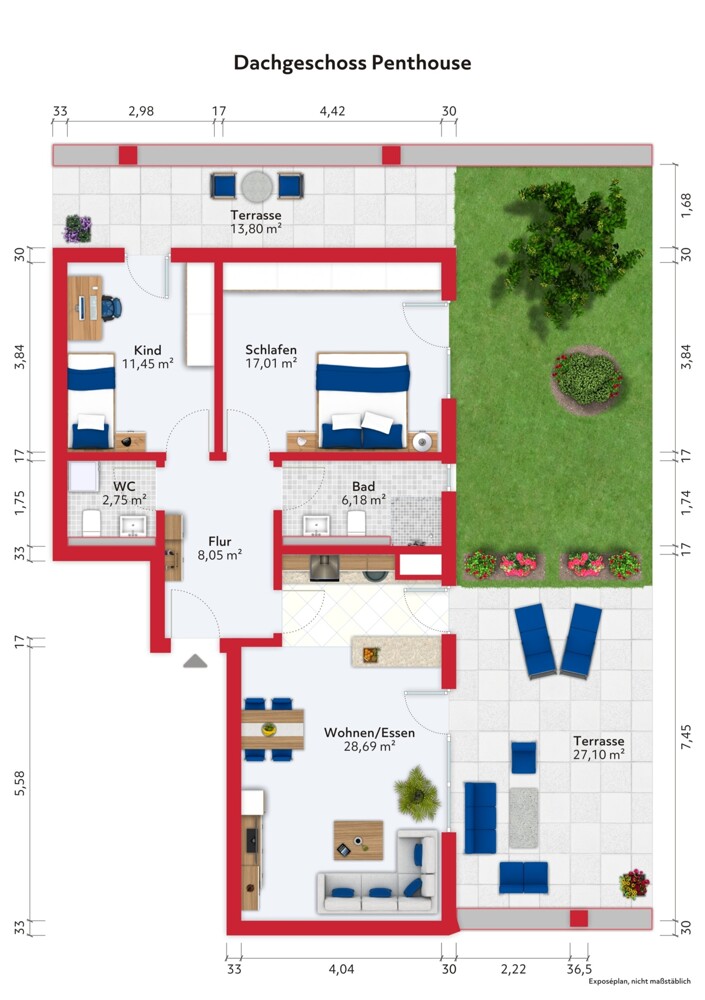 Die Wohnung selbst bietet eine Gesamtwohnfläche von 95,14m². Dabei stehen zwei Schlafzimmer, ein Wohn-Esszimmer mit offener Küche, ein Bad mit bodentiefer Dusche und WC, ein separates Gäste-WC und eine Diele zur Verfügung. Zusätzlich stehen zwei Dachterrassen mit einer Gesamtfläche von 40m² zur Verfügung. Die kleinere davon ist nach Süden (SSW) ausgerichtet und hat 13,8m², die größere bietet mit 27,1m² viel Platz für Grill und Outdoormobiliar und ist dank der Westausrichtung (WWN) Ihr Platz für den abendlichen Sundowner in den Sommermonaten.
