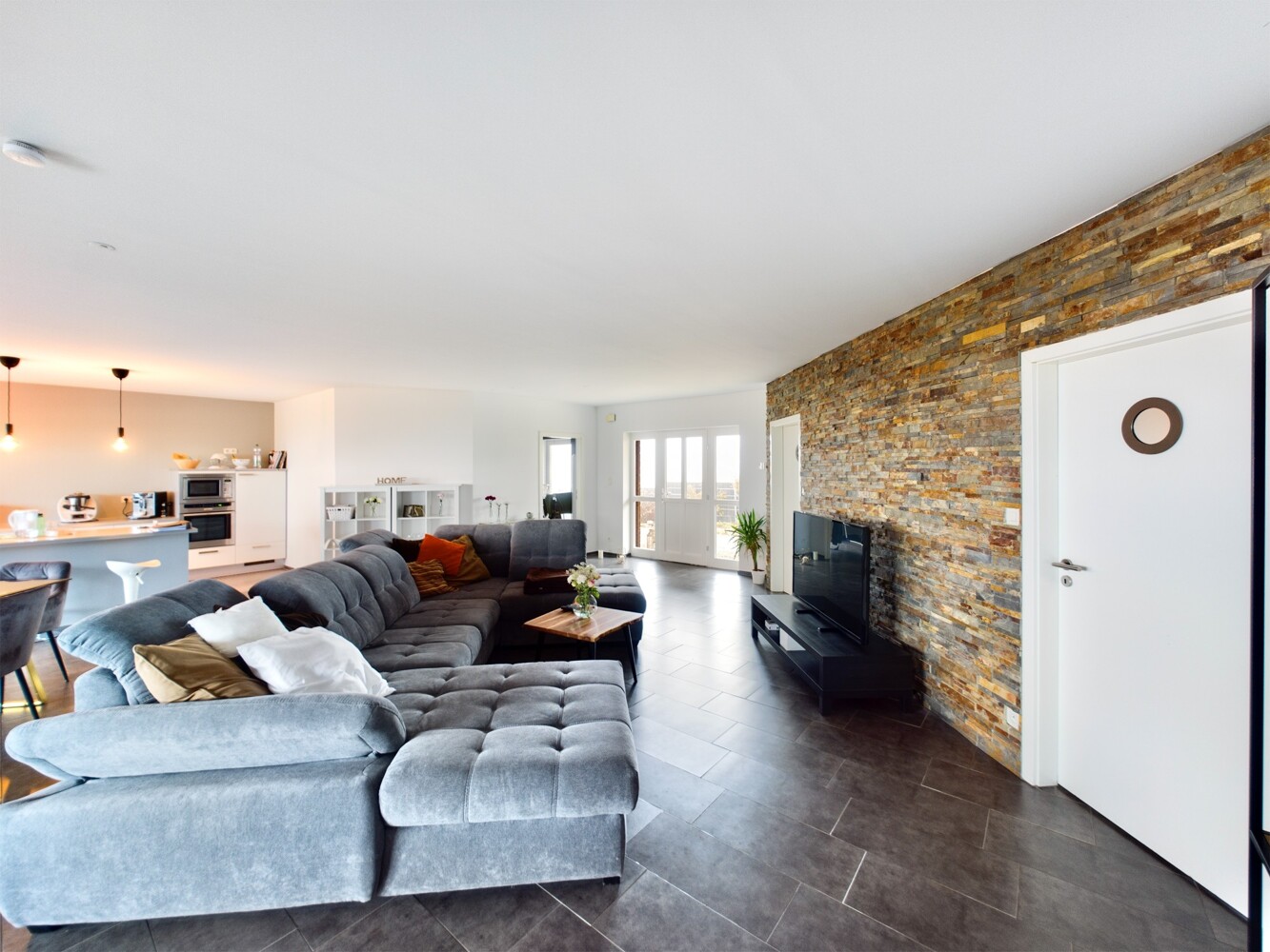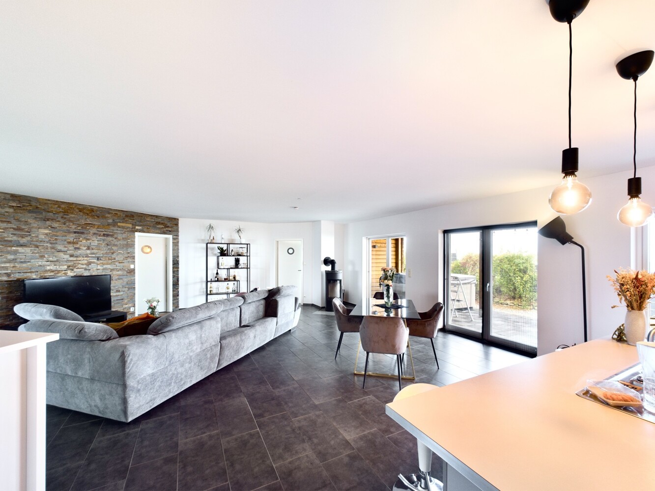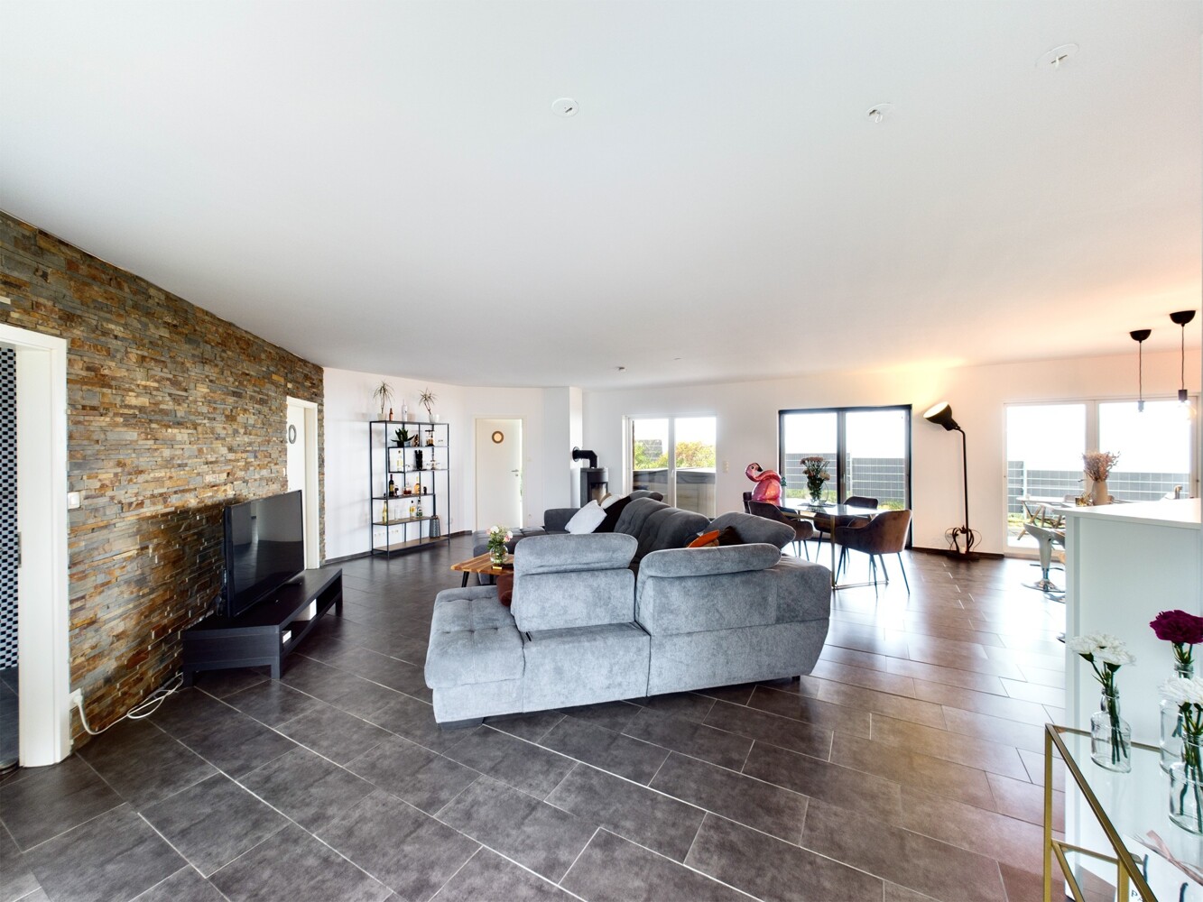 Dunkle Fliesen, weiße Wände und große Fensterelemente sorgen für viel Licht und laden zu einem modernen Wohnen ein.