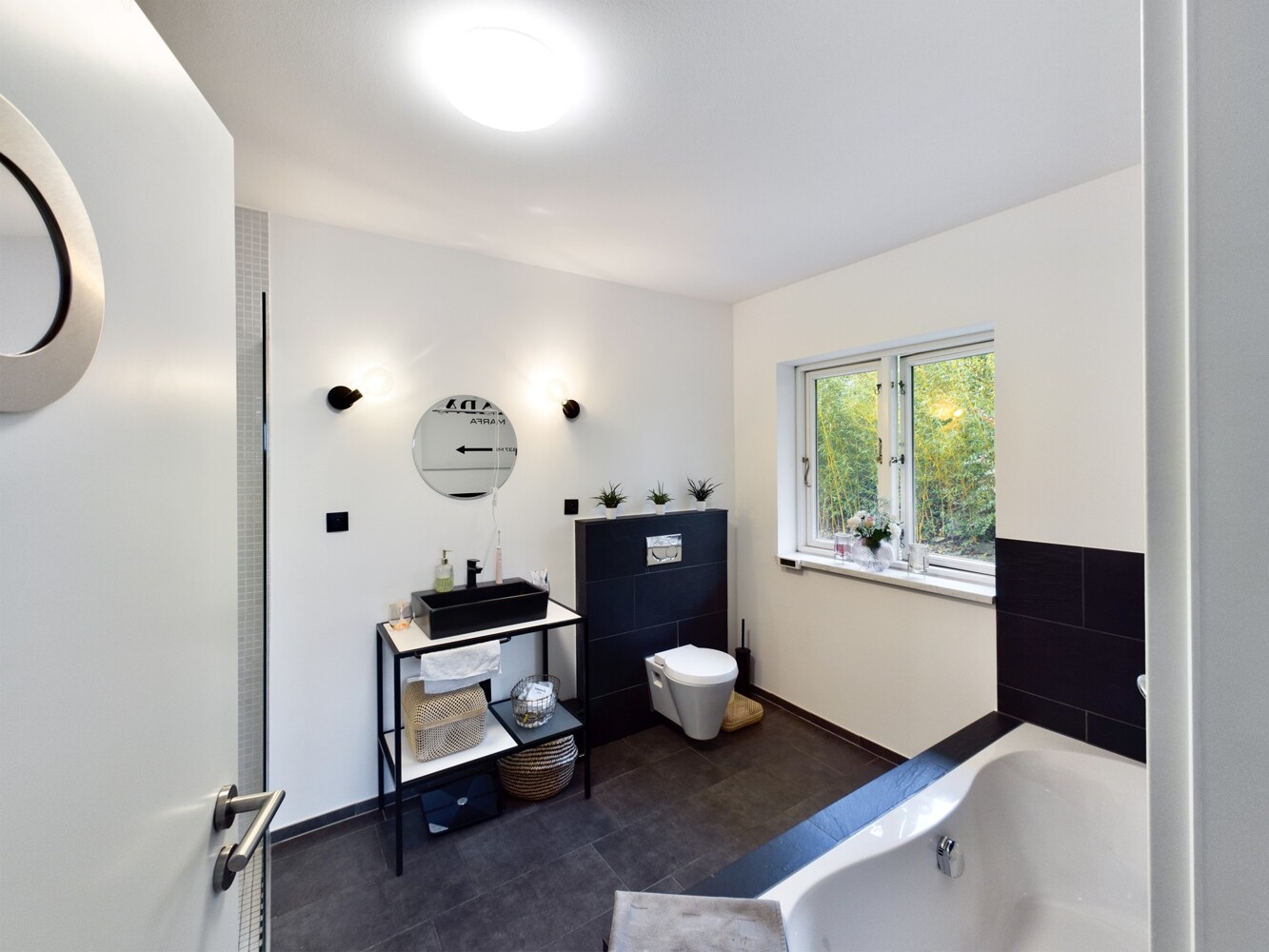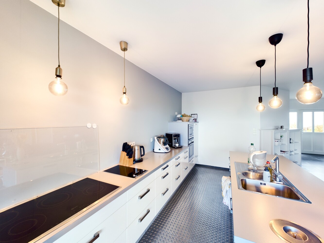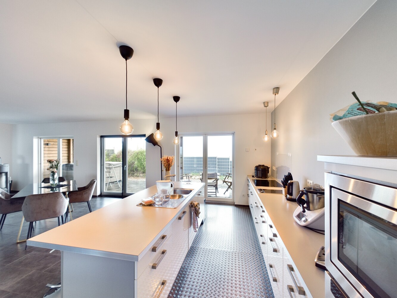 Dunkle Fliesen, weiße Wände und große Fensterelemente sorgen für viel Licht und laden zu einem modernen Wohnen ein.