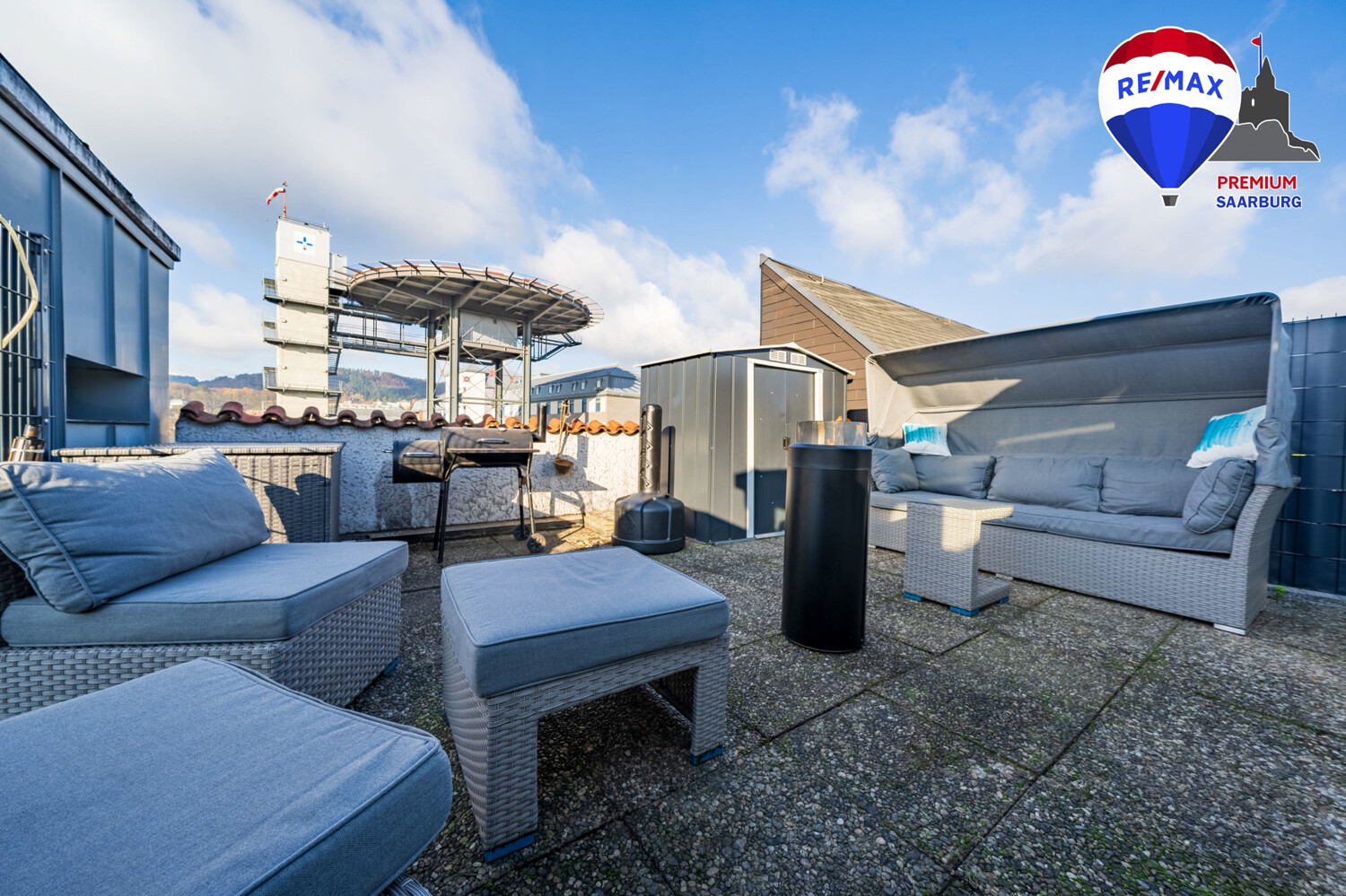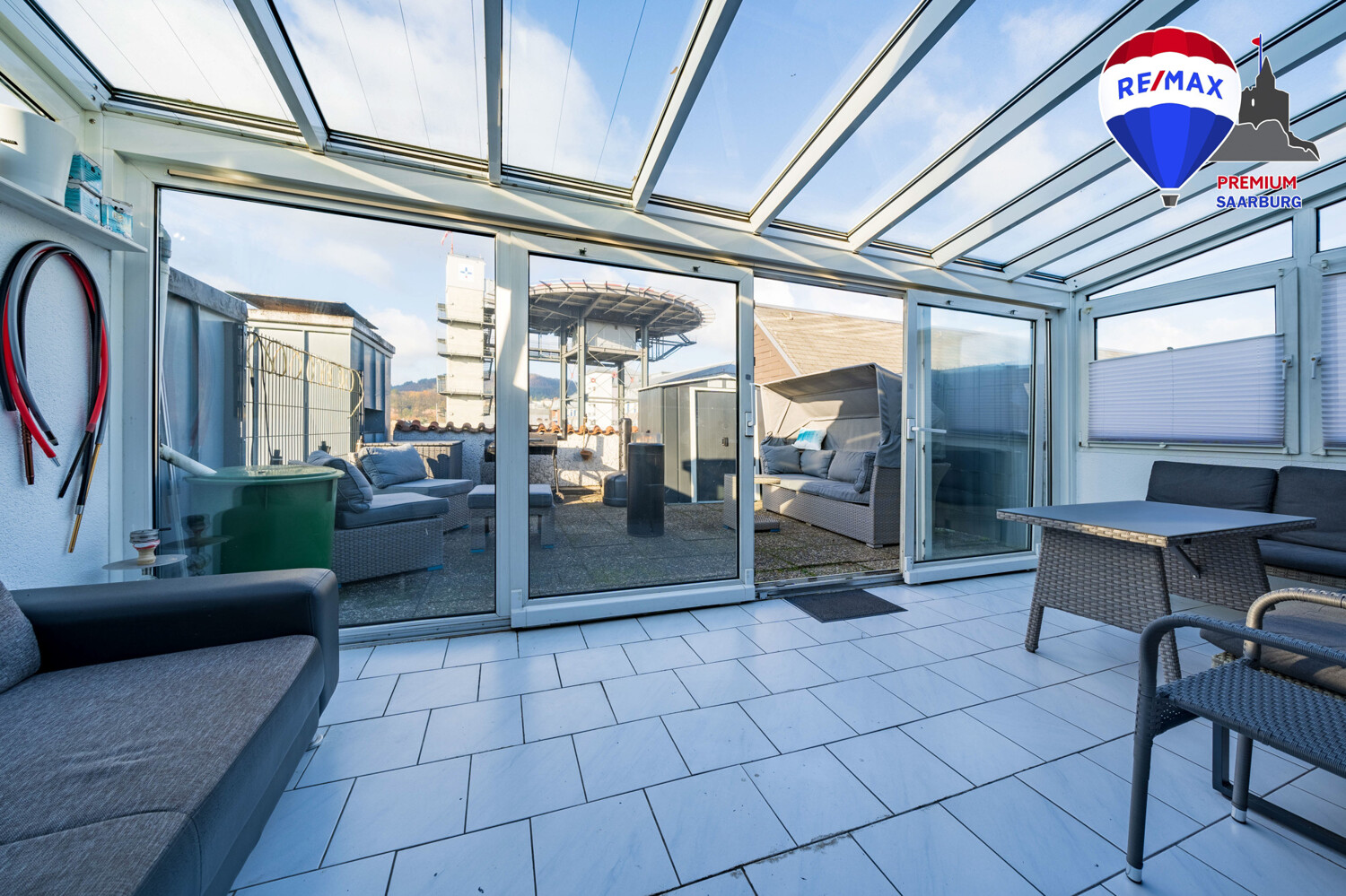 Von der gegenüberliegenden Seite des Flurs gelangen Sie durch eine Terrassentür in den nachträglich angebauten Wintergarten, welcher zum gemütlichen Verweilen einlädt. Durch den Wintergarten erreichen Sie wiederum mittels zweier großer Glasschiebetüren das mit größte Highlight dieser Immobilie: Die große Dachterrasse mit einem tollem Ausblick über die Stadt. Hier können Sie es sich mit Ihren Freunden und Bekannten an schönen Sommertagen zu einem kühlen Getränk, zum Grillen oder einfach mal zum Entspannen gemütlich machen. Genießen Sie hier die Sonne und ebenso lange Sommerabende.