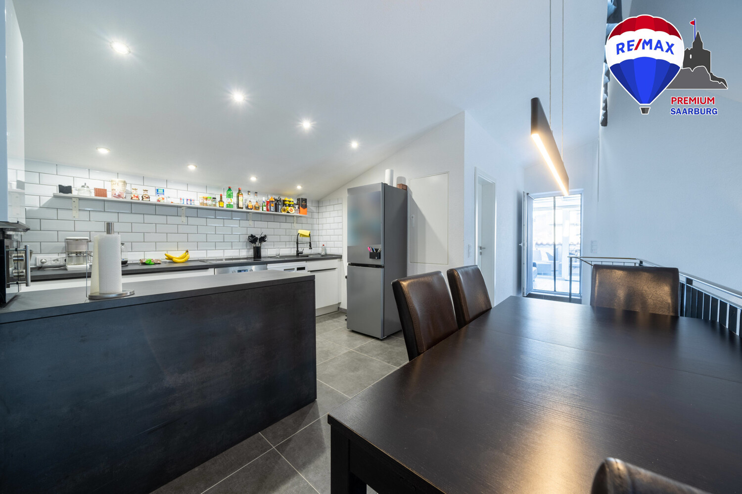 Weiter im Gang erreichen Sie den offenen Küchen- und Essbereich, in dem sich eine neuwertige Einbauküche inkl. Elektrogeräte aus dem Jahre 2020 befinden. Die Küche bietet Ihnen alles, was man heutzutage zum modernen Kochen benötigt und durch die große Kücheninsel haben Sie genug Platz, um sich hier in Zukunft voll und ganz auszuprobieren.